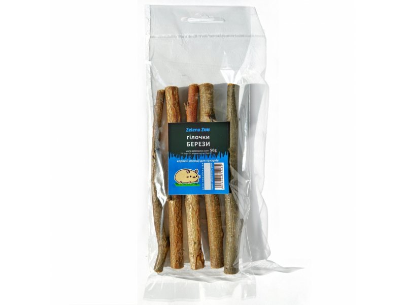 Веточки березы Zelena Zoo - натуральные веточки деревьев. Обязательная добавка к кормам шиншилл, дегю, кроликов, морских свинок, крыс, хомяков и мышек. Постоянное потребление палочек обеспечивает отличное состояние зубов на долгое время. Регулярно заменяйте съеденные палочки свежими. Ветки плодовых деревьев и кустарников обязательно должны входить в ежедневный рацион грызунов и кроликов. Это необходимо не только для разнообразия их рациона, но и для сточки постоянно растущих зубов. Очень важно давать ветки с корой, поскольку именно кора является основным источником питательных веществ. Ветки содержат значительное количество ценных белков, витаминов, минеральных веществ и микроэлементов.