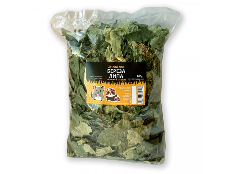 Береза/Липа ЗЕЛЕНЫЙ РАЦИОН для грызунов и птиц 100 г Zelena Zoo – здоровое удовольствие на каждый день. Сбалансированная, богатая смесь листьев – это здоровое дополнение к ежедневному рациону грызунов. Зеленый рацион Береза/Липа прекрасно пахнет и является важной частью меню пушистиков.