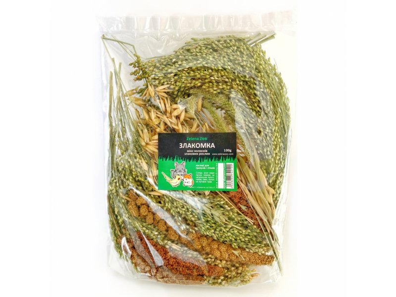 Микс колосков злаковых растений 100 г Злакомка 100 г Zelena Zoo - это прекрасный корм для птиц, особенно для волнистых попугаев и мелких грызунов, таких, как хомячки. Просо в колосках это и лакомство и основной корм, который позволяет не только получить удовольствие от вкуса, но и является прекрасной возможностью физических занятий для птицы: птичка сама выклевывает зерна из натуральных соцветий. А хомячки и мышки строят себе домики. Добавляйте просо в колосках в рацион вашего любимца. Это особенно необходимо перед периодом размножения, во время линьки, а также для подкормки птицы.