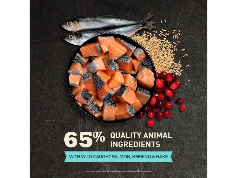Інгредієнти: Сирий цільний лосось (15%), дегідратований лосось (15%), дегідратований оселедець (15%), цільний овес, цільний горошок, жир минтая (8%), цільна зелена сочевиця, сирий цільний хек (4%), сирий цільний оселедець (4%), цільний нут, цільна червона сочевиця, клітковина сочевиці, сира форель (2%), олія лосося (2%), соняшникова олія, висушені водорості, свіжий цільний мускатний гарбуз, свіжий цільний гарбуз, свіжа цільна журавлина, свіжа цільна чорниця.