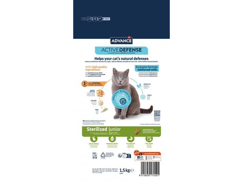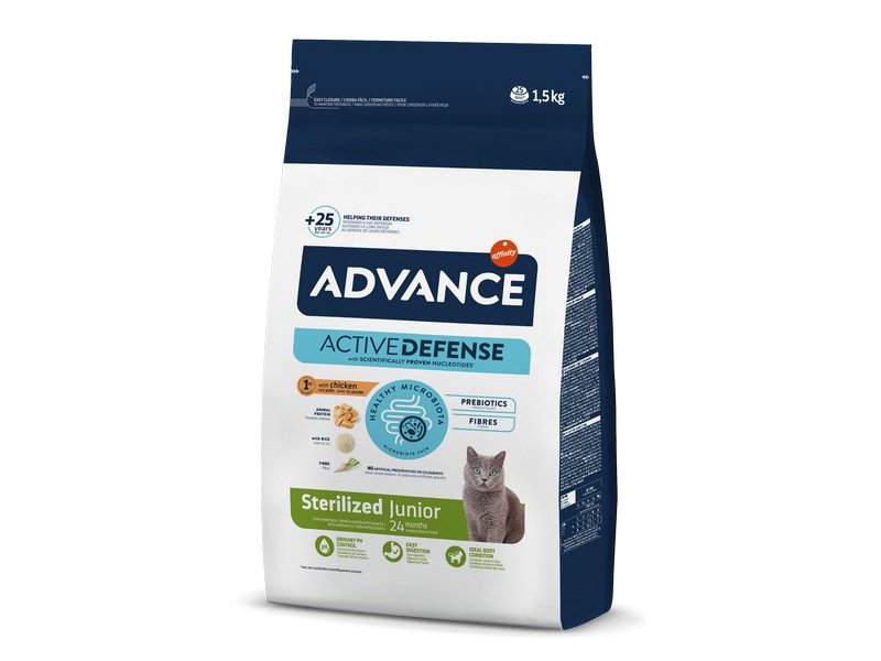 ADVANCE CAT JUNIOR STERILIZED є ідеальним кормом для молодих стерилізованих котів, що забезпечує всі необхідні поживні речовини для здорового росту та розвитку. Він враховує унікальні вимоги стерилізованих котів, допомагаючи підтримувати ідеальну вагу, міцне здоров'я та високий рівень енергії.