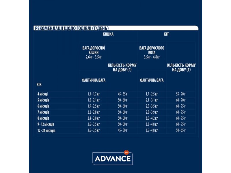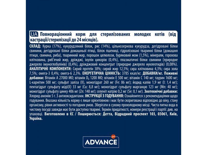 СКЛАД Advance Junior Sterilized: курка (17%), кукурудзяний білок, рис (14%), цільнозернова кукурудза, дегідровані білки свинини, дегідровані білки домашньої птиці, білок пшениці, гідролізовані тваринні білки (домашня птиця, свинина, риба), тваринний жир, порошок целюлози, буряковий жом (1,5%), мінерали, горохова клітковина, риб'ячий жир, дріжджі, інулін цикорію (0,4%), плазматичні білки свинини (природне джерело імуноглобулінів) (0,4%), дріжджовий концентрат (природне джерело нуклеотидів) (0,08%). АНАЛІТИЧНІ КОМПОНЕНТИ: Сирий протеїн 38%; сирий жир 12,5%; сира клітковина 4,3%; сира зола 7,5%; омега-3 0,4%; омега-6 2,3%.