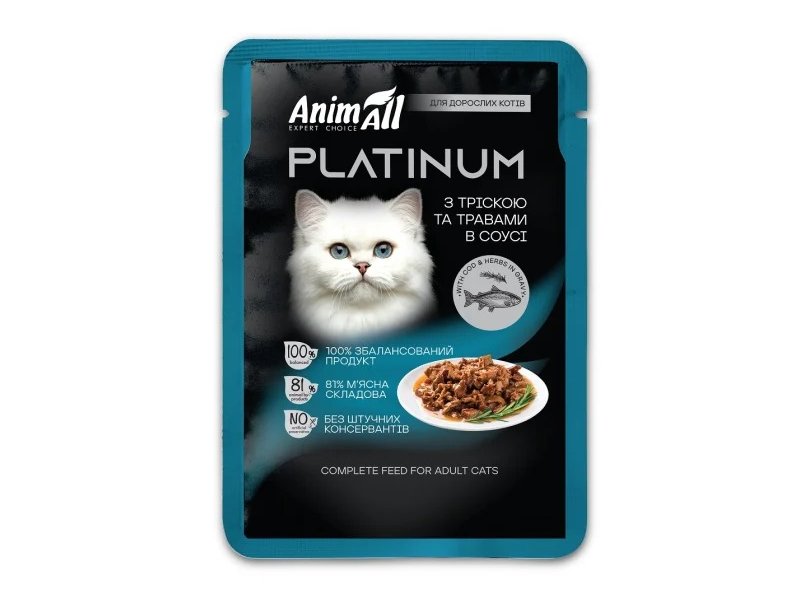 AnimAll Platinum: смачне поєднання тріски та курки для вашого гурмана. Подаруйте своєму котику справжню гастрономічну насолоду з лінійкою AnimAll Platinum. Цей беззерновий вологий корм у форматі паучів створений для дорослих котів, які цінують ніжні текстури та вишукані смаки. Поєднання дієтичної курки, ароматної тріски та корисних трав у густому соусі робить цей раціон не лише смачним, а й максимально корисним.