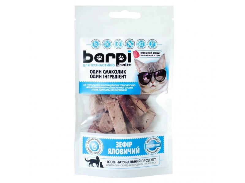 Натуральний «Зефір яловичий» від Barpi — це легкий і ніжний снек із яловичих легень, створений спеціально для котів. Він багатий на білок та мікроелементи, легко засвоюється та не навантажує травну систему. Завдяки делікатному сушінню зберігає природну користь, смак і аромат, які обожнюють коти.