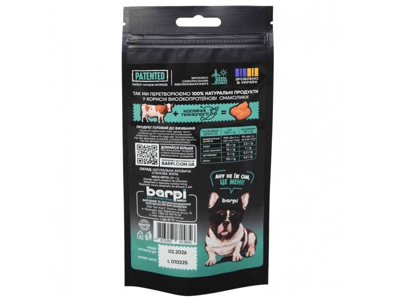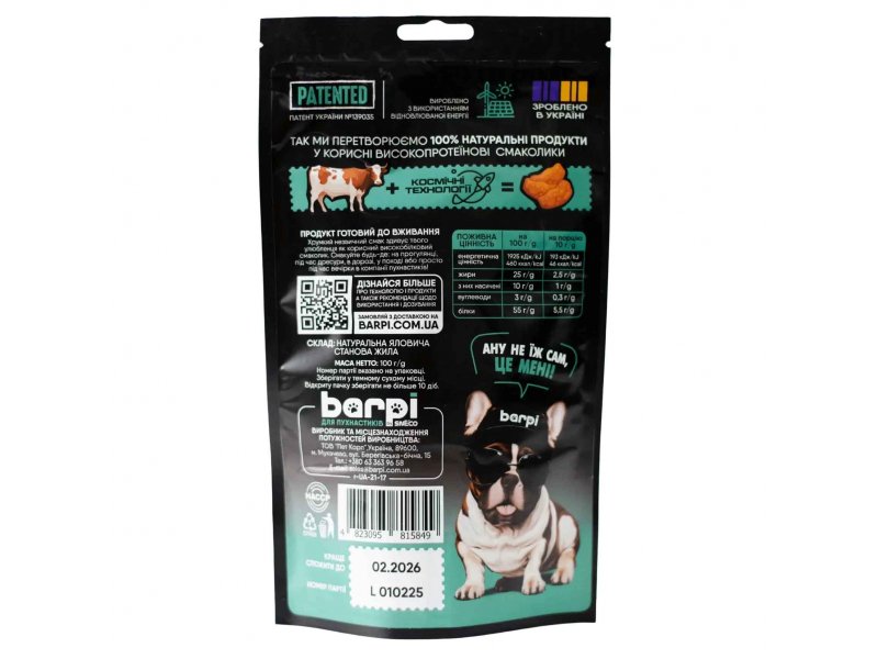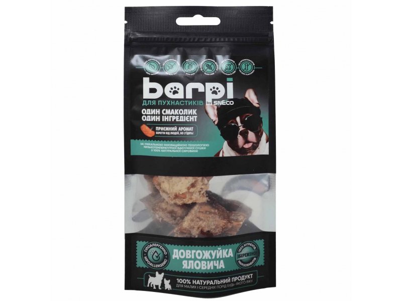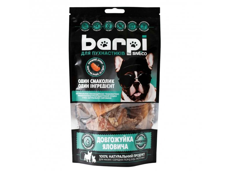 Натуральні хрусткі ласощі для ваших улюбленців — «Довгожуйка яловича (станова жила)» від Barpi. Це преміальний снэк із 100% натуральної яловичої жили, багатий на колаген, еластин і білки — ідеальний вибір для собак, які люблять довго жувати. Завдяки жорсткій текстурі він допомагає очищати зуби від нальоту, зміцнює ясна і сприяє здоровому стану суглобів та зв’язок. А технологія низькотемпературного сушіння зберігає максимум корисних речовин і природний смак — без штучних добавок та консервантів.