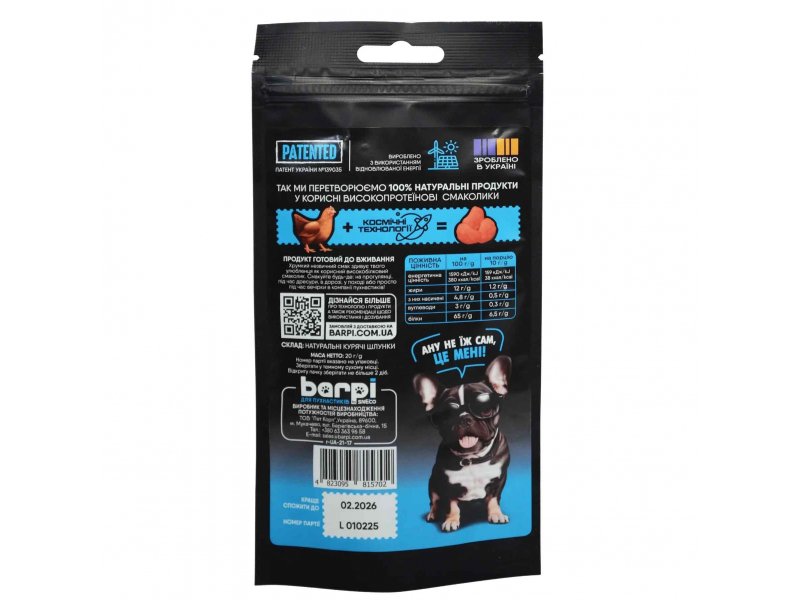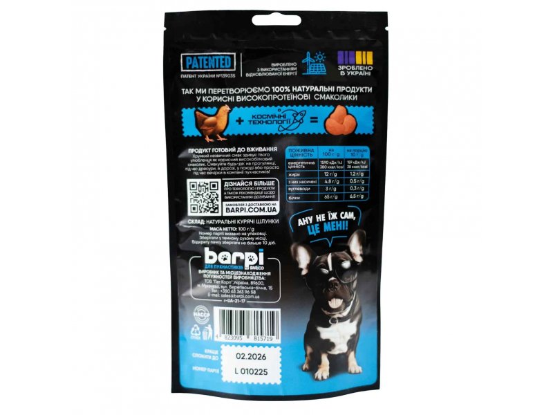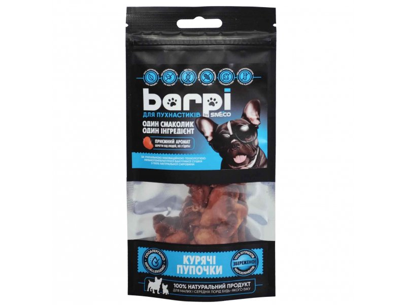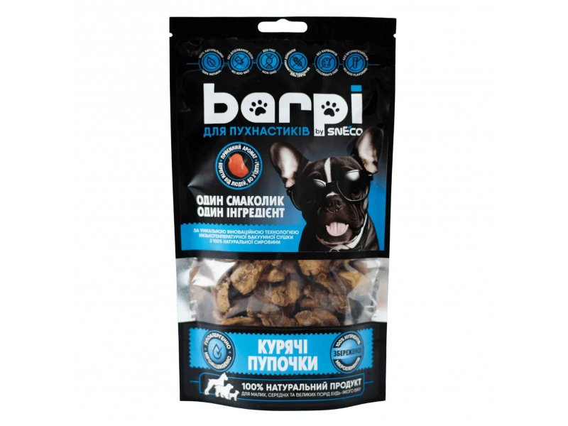 Натуральні хрусткі ласощі для вашого чотирилапого друга — «Курячі пупочки (шлунки)» від Barpi. Сушені без термічної обробки, без штучних добавок, вони містять високоякісний білок, залізо та цинк — ідеальні для підтримки енергії, імунітету та задоволення.