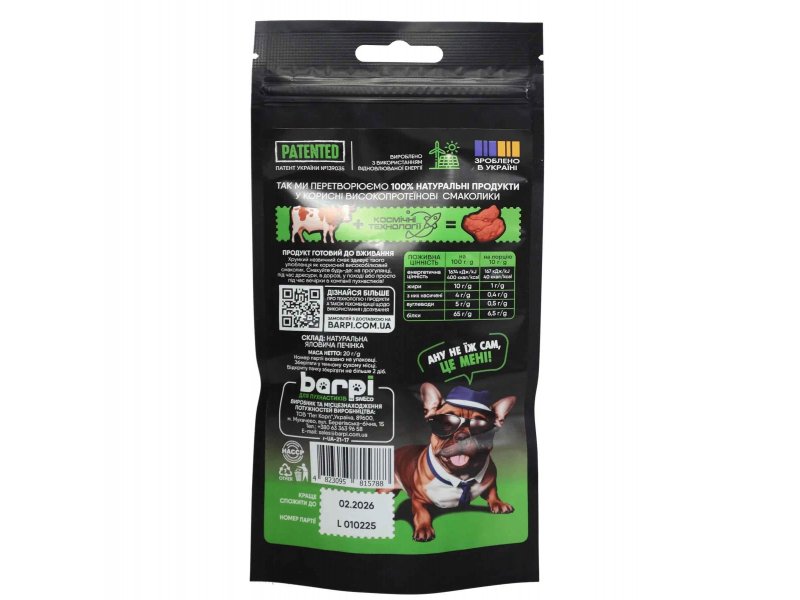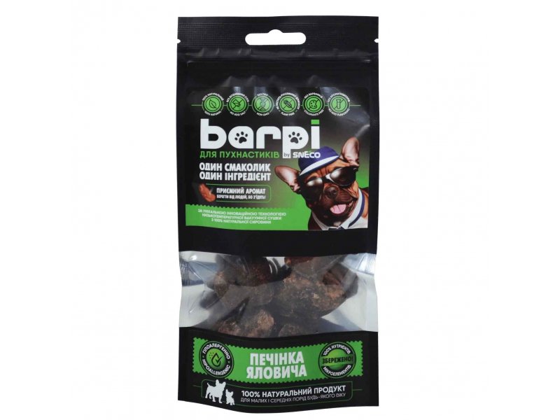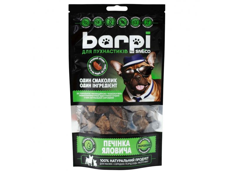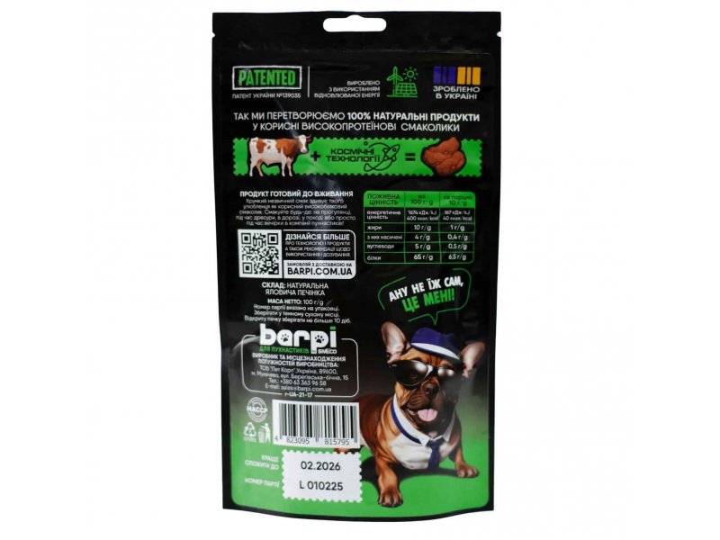 Натуральні хрусткі ласощі для ваших улюбленців — «Печінка яловича» від Barpi. Виготовлені з 100 % яловичої печінки, ці ласощі багаті на легко засвоюваний білок, залізо, вітаміни A, B12, B6 та мікроелементи (цинк, мідь, селен) — усе це допомагає зміцнити імунітет, підтримати блискучу шерсть і належне постачання киснем організму.
