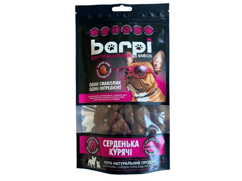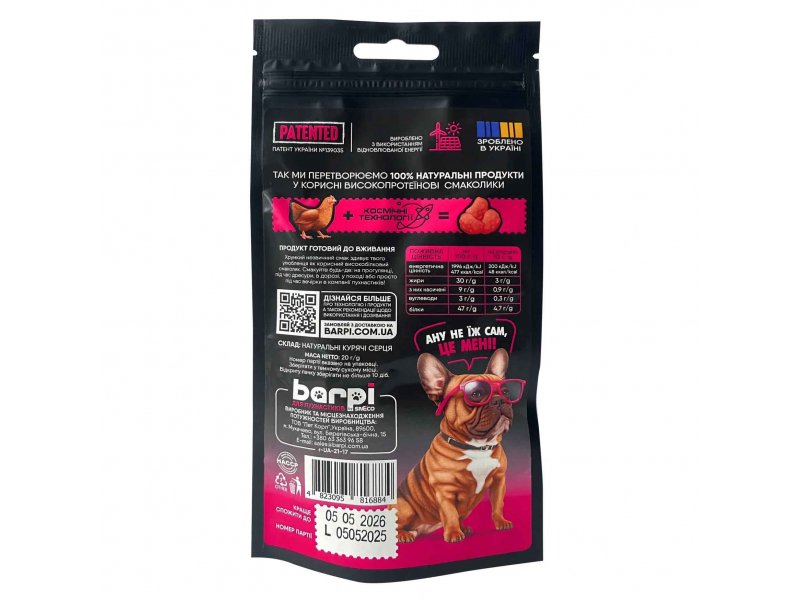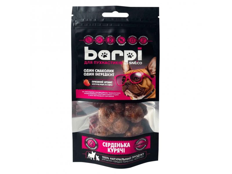 Натуральні хрусткі ласощі для вашого пухнастого друга — «Серденька курячі» від Barpi. Виготовлені з високоякісних курячих сердечок, вони містять до 70 % білка, а також важливі мікроелементи — залізо, цинк, мідь та вітамін B12 — для підтримки енергії, здоров’я шкіри, шерсті й імунітету.