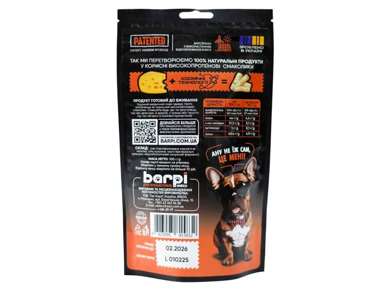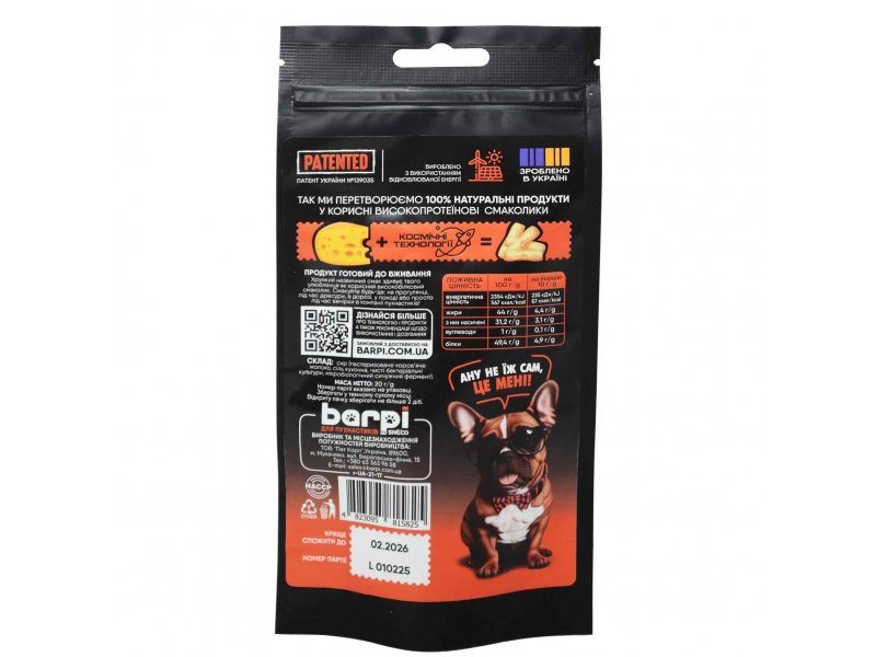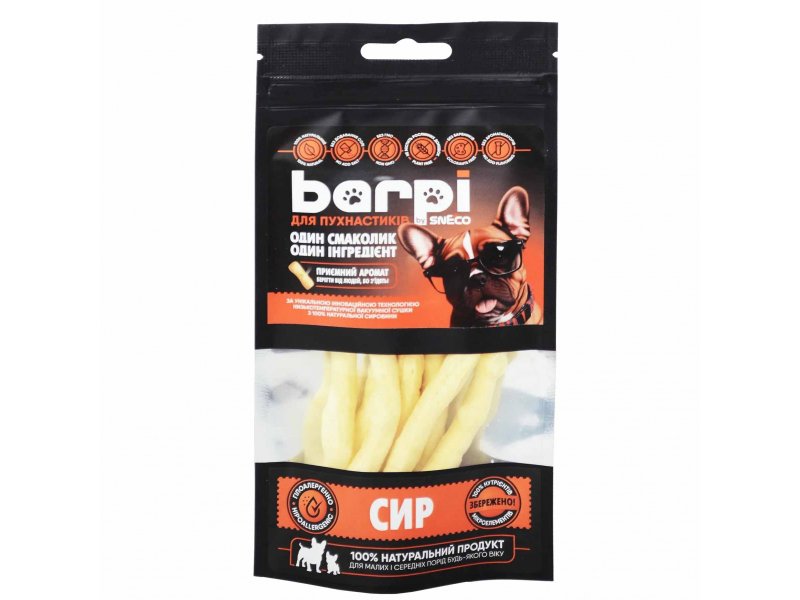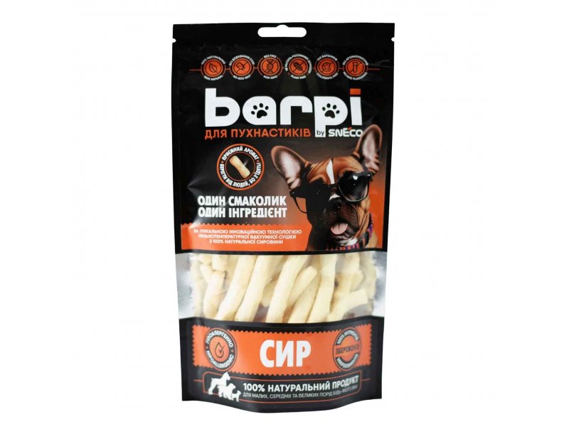 Ласощі Barpi «Сир» — це натуральна суха закуска, створена з вершкового коров’ячого сиру, спеціально для собак, які заслуговують найкращого. Високий вміст білка та кальцію підтримує м’язову силу, здоров’я кісток і зубів, а м’яка та хрустка текстура стимулює бажання улюбленця до активності. Використовуючи передові технології сушіння, виробник зберігає максимальну кількість поживних речовин та природний аромат сиру, без додаткової термічної обробки. Ця закуска ідеальна як винагорода під час тренування або як смачний перекус на прогулянці — зручно брати із собою завдяки компактній упаковці. Barpi «Сир» — це поєднання простоти натурального інгредієнта, функціональності для собаки і турботи про її раціон.