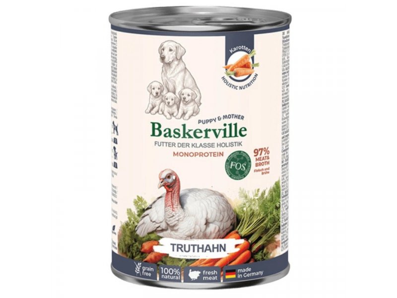 Склад Baskerville Holistic Puppy & Mother: iндичка 68% (індиче серце, м’ясо, печінка, шлунки, шийки), бульйон з індички 27,5%, морква1%, пастернак 1%, персик 1%, мінерали 1%, лососева олія 0,4%, Фруктоолігосахариди (ФОС) 0,1%.
