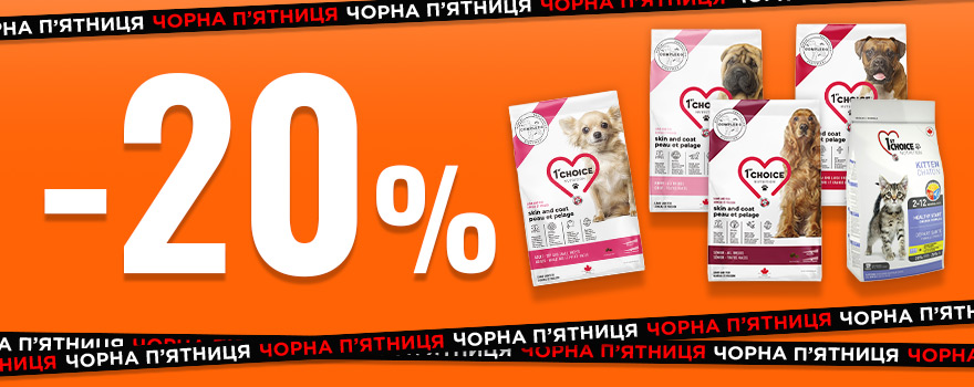 ЧОРНА П’ЯТНИЦЯ від 1st Choice: знижка 20% на корм для котів і собак! Тільки зараз найвигідніша пропозиція року на канадський супер-преміум корм 1st Choice. Забезпечте своєму улюбленцю здорове харчування за найкращою ціною!