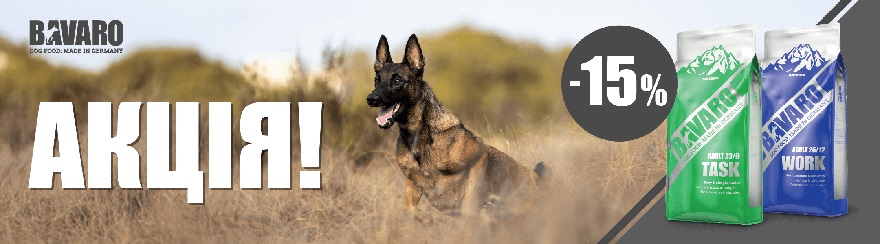 Тільки зараз — знижка 15% на сухий корм для собак Bavaro! Не пропустіть можливість придбати якісне німецьке харчування для свого улюбленця за вигідною ціною. Акція діє на асортимент сухих кормів Bavaro — від повсякденних до спеціалізованих раціонів для активних чи вибагливих собак.