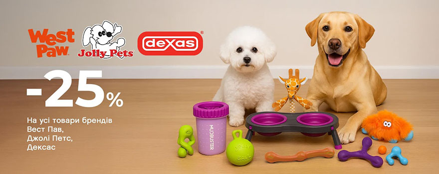 Акція на товари West Paw, Jolly Pets, Dexas: знижка до 25%! Скористайтеся можливістю придбати найміцніші та найяскравіші іграшки, миски, гребінці та аксесуари від топових американських брендів зі знижкою до 25%. Порадуйте своїх котів і собак якісними речами, які служать роками!