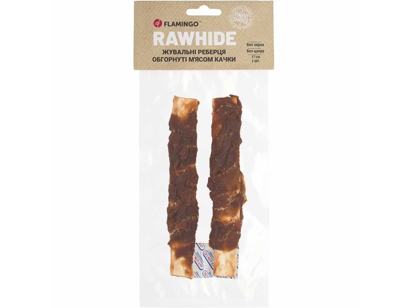 Склад: Сиром’ятна шкіра 68%, качка 26,5%, крохмаль батату 1,75%, гліцерин 1,75%, рослинний білок 1,75%, сіль 0,25%.