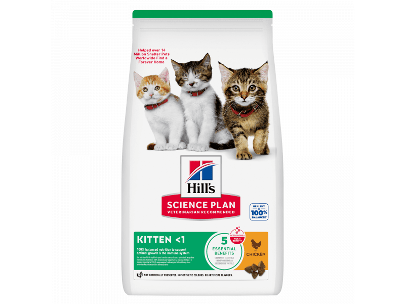 Hill's Science Plan Kitten – повнораціонний сухий корм із куркою, для кошенят віком до 1 року. Це комплексне збалансоване харчування, спеціально розроблене для зміцнення імунної системи та здорового травлення кошеняти. Раціон містить омега-3 жирні кислоти, що сприяють розвитку сітківки та покращують зір. Легкозасвоювані білки та збалансована кількість мінералів сприяють розвитку та росту вашого кошеняти.
