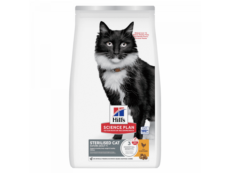Hill's Science Plan Feline Mature Adult 7+ Sterilised Cat Курка спеціально розроблений для забезпечення особливих потреб кастрованих котів та стерилізованих кішок. Розроблений з клінічно доведеними антиоксидантами та унікальною Формулою контролю ваги.
