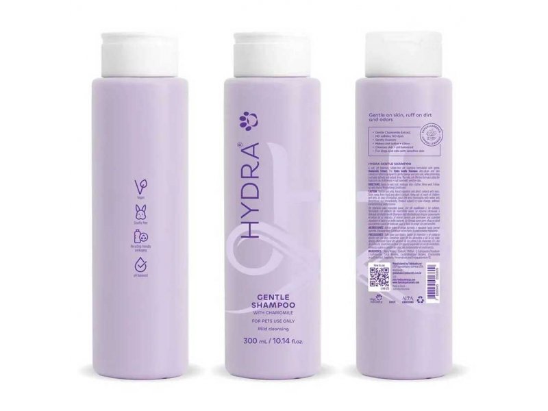 Hydra Retail Gentle Shampoo - м’який шампунь для домашніх тварин з нейтральним pH, без сульфатів, з додаванням ніжного екстракту ромашки. Надзвичайно м’яка піна шампуню Hydra Gentle Shampoos, що не подразнює шкіру, призначена для м’якого очищення та дезодорування шерсті ваших улюбленців, надаючи їй приємну на дотик м’якість та блиск. М’яка, але ефективна формула ідеально підходить для собак і котів усіх порід та типів шерсті віком від 4 тижнів з чутливою шкірою.