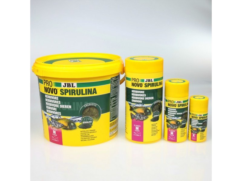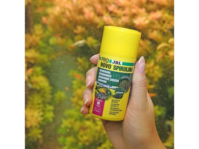 JBL PRONOVO SPIRULINA FLAKES M – повноцінний основний корм у вигляді зелених пластівців з високим вмістом спіруліни (близько 20 %), призначений для всіх акваріумних риб довжиною приблизно 8–20 см, передусім травоїдних та всеїдних видів, що живляться водоростями й обростаннями. Плаваючі пластівці мають пребіотичний ефект, підтримують здорову мікрофлору кишечника, яскраве забарвлення та загальний імунітет риб.