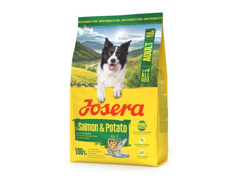 Складові Josera Salmon & Potato: Картопля, сушена 48,0 %; Лосось, сушений 19,0 %; Жир домашньої птиці; Бурякова клітковина; Картопляний білок; Борошно плодів ріжкового дерева; Риб’ячий білок, гідролізований; Мінерали; Корінь цикорію, мелений (природнє джерело інуліну); Трави, Фрукти.