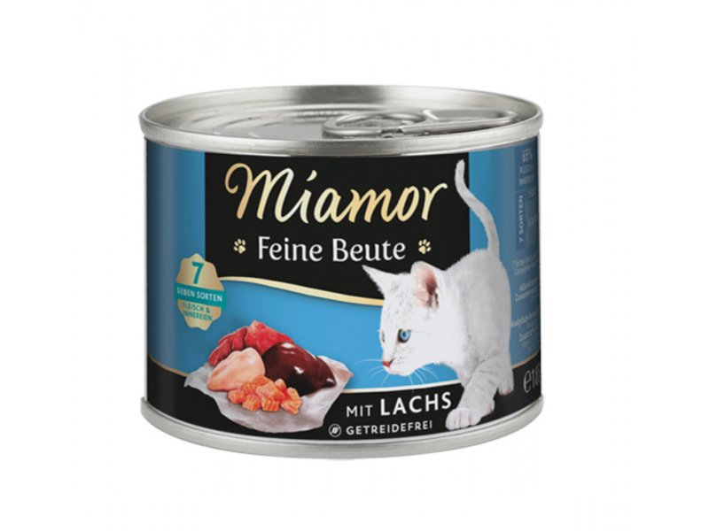 Miamor Feine Beute mit Lachs – це 7 видів м’яса та субпродуктів, зокрема й делікатесний лосось: 7 смаків для 7 життів вашого кота! Цей вологий корм створений з урахуванням природних потреб котів, особливо тих, хто обожнює рибу. У дикій природі вони харчуються виключно м’ясом, і найохочіше - рибою. Тому в складі немає пшениці, кукурудзи, сої та інших наповнювачів – тільки цінні м’ясні та рибні інгредієнти, необхідні для енергії, сили та здоров’я вашого улюбленця.