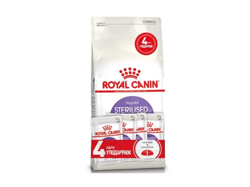 | зайва вага (сухий корм + павуч Royal Canin Sterilised) | 21 г + 1 пауч | 29 г + 1 пауч | 37 г + 1 пауч | 44 г + 1 пауч |