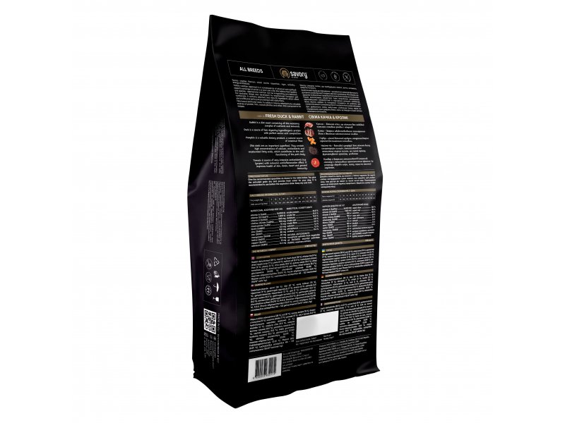 Сухий корм для собак усіх порід Savory містить якісне м'ясо качки та кролика, суперфуд, яблука, гарбуз та куркуму. Ці компоненти створені природою для оптимальної кондиції, здорових суглобів та розкішного вигляду собачки.