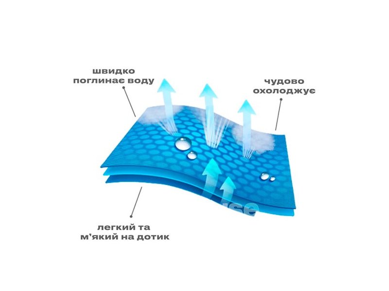 - Виготовлено з сучасного матеріалу — високоякісної мікрофібри, яка має як вологопоглинаючі, так і охолоджуючі властивості, завдяки чому рушник підходить для різних ситуацій.
