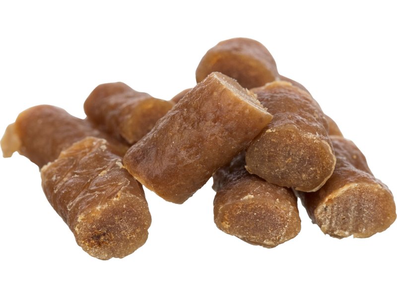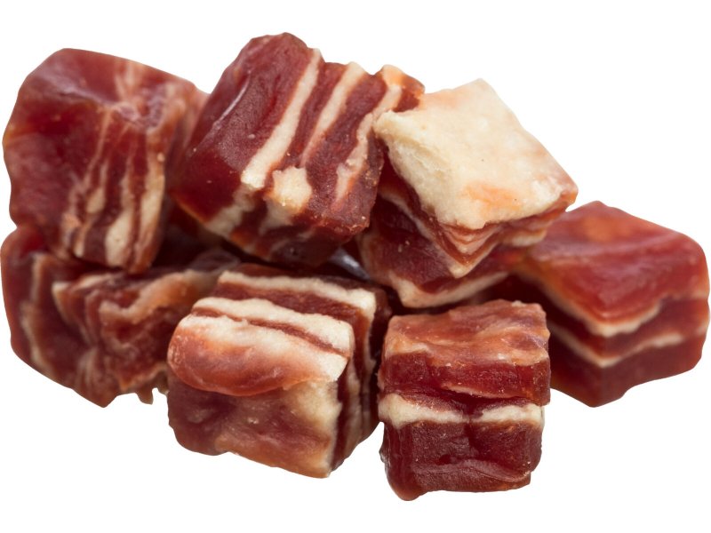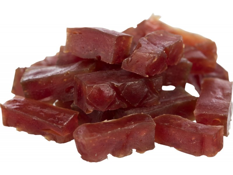 Fish Duck Stripes: м'ясо качки (60%), риба (20%), екстракти рослинних білків, картопляний крохмаль, рослинні субпродукти, сорбіт, мінеральні речовини