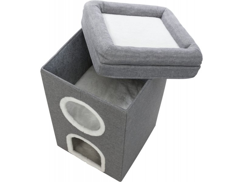 Конструкція дуже зручна, оскільки будиночок має знімну кришку з невеликими бортиками і майданчик для відпочинку кішки. Внутрішні знімні полички мають м'яку плюшеву оббивку. Таку ж оббивку має і кришка будиночка, а також нею оздоблені входи.