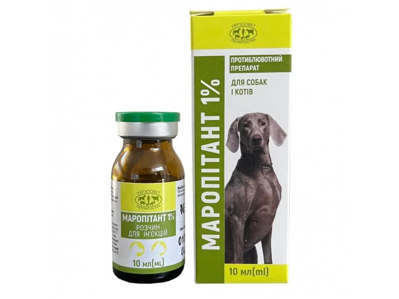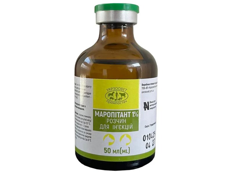 УкрЗооВетПромПостач Маропітант 1% від – це ефективний протиблювотний засіб для собак і котів, розроблений для швидкого і надійного полегшення симптомів нудоти і блювоти. На основі активної речовини маропітант цитрату моногідрату, цей препарат застосовується для лікування і профілактики блювоти, викликаної хіміотерапією, іншими захворюваннями або підтримуючими заходами, за винятком кінетозу (закачування). Завдяки зручній формі розчину для ін'єкцій (доступний у флаконах по 10 мл і 50 мл), Маропітант забезпечує швидке всмоктування і тривалий ефект, допомагаючи вашим улюбленцям швидко відновлюватися і повертатися до активного життя, з мінімальними побічними реакціями при правильному застосуванні.