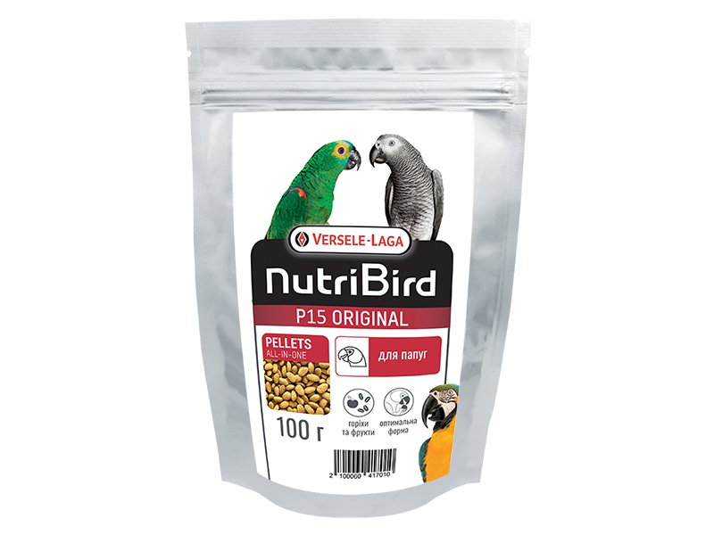 Склад Versele-Laga NUTRIBIRD P15 Original : злаки, горіхи (очищений арахіс 10%), похідні рослинного походження, овочі, мінерали, рослинні олії та жири, насіння (3%), фрукти (яблуко 5%), цукри, маннанолігосахариди (МОС), екстракт юки Шидигера.