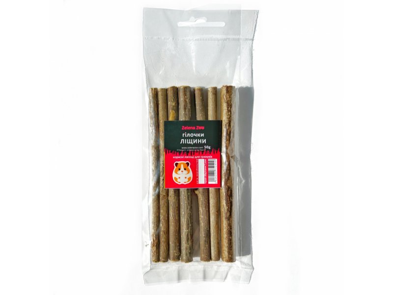 Гілочки ліщини Zelena Zoo - натуральні гілочки дерев. Обов'язкова добавка до кормів шиншил, дегу, кроликів, морських свинок, щурів, хом'яків і мишок. Постійне споживання паличок забезпечує відмінний стан зубів на довгий час. Регулярно замінюйте з'їдені палички свіжими. Гілки плодових дерев і чагарників обов'язково повинні входити в щоденний раціон гризунів і кроликів. Це необхідно не тільки для урізноманітнення їхнього раціону, а й для сточування постійно зростаючих зубів. Дуже важливо давати гілки з корою, оскільки саме кора є основним джерелом поживних речовин. Гілочки містять значну кількість цінних білків, вітамінів, мінеральних речовин і мікроелементів.