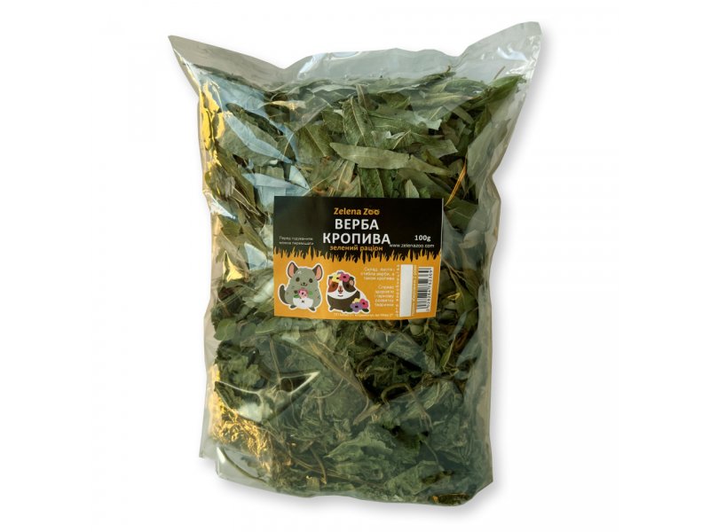 Верба/Кропива ЗЕЛЕНИЙ РАЦІОН для гризунів 100 г Zelena Zoo - ароматна суміш прямо з природи. Цей зелений раціон ми створили для гармонійного поєднання речовин, які присутні в Вербі бо розріджують кров, і тих речовин, які кров згортають, - на них багата Кропива.